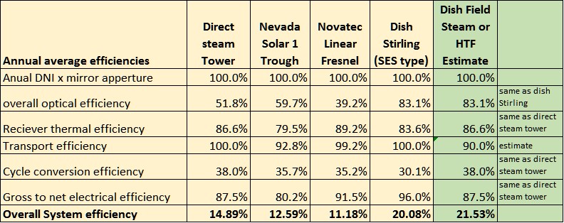 To make the performance argument in a quantitative manner, results from established validated models of the various system types can be compared. A well respected and freely available approach to modelling performance is the US National Renewable Energy Laboratory’s “System Advisor Model” (SAM) (https://sam.nrel.gov/). Using some of the available CSP system models in SAM to examine operation over a typical year at using solar data for Barstow California gives the following results:
